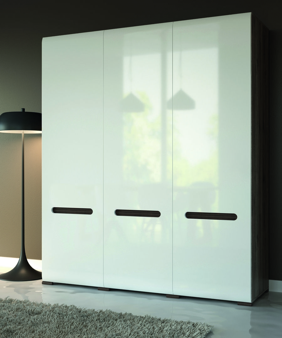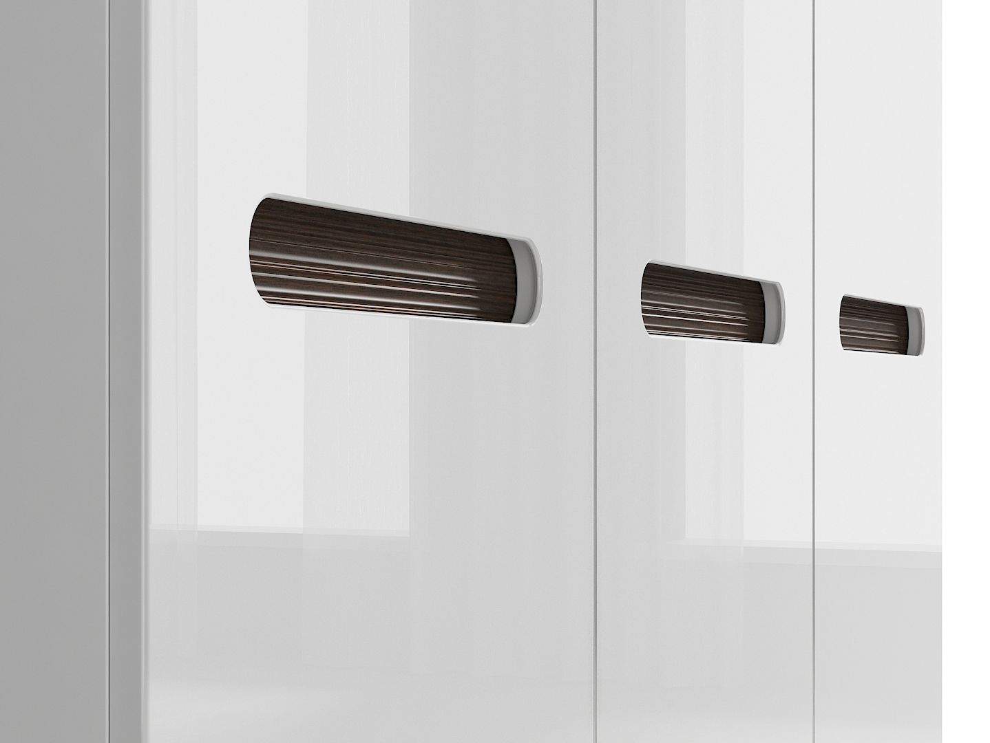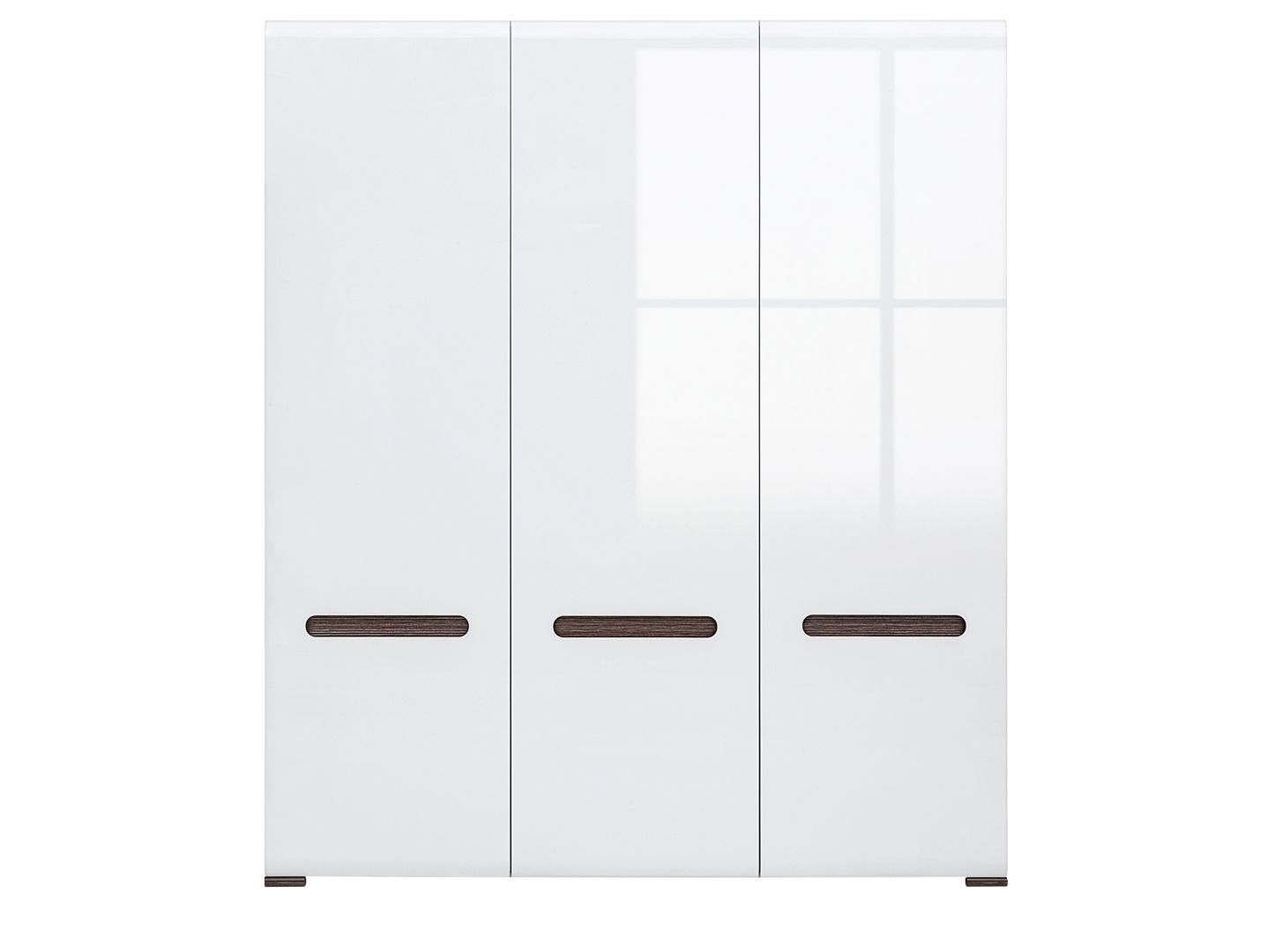 распашные глухие двери, за левой и средней – в верхней части расположена 1 ниша и штанга стационарная металлическая для одежды, в нижней части расположена 1 ниша, за правой расположены 5 полок