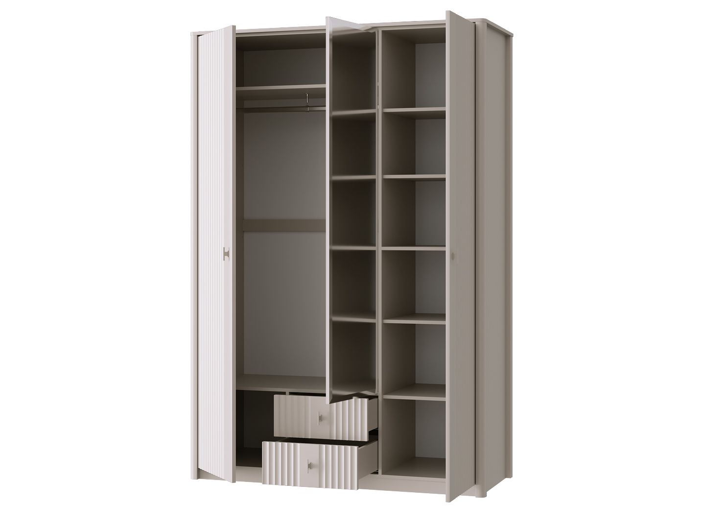 в левой части шкафа за распашной дверью шкафа с рифленой текстурой из МДФ расположена металлическая штанга для одежды и нижняя полка для хранения