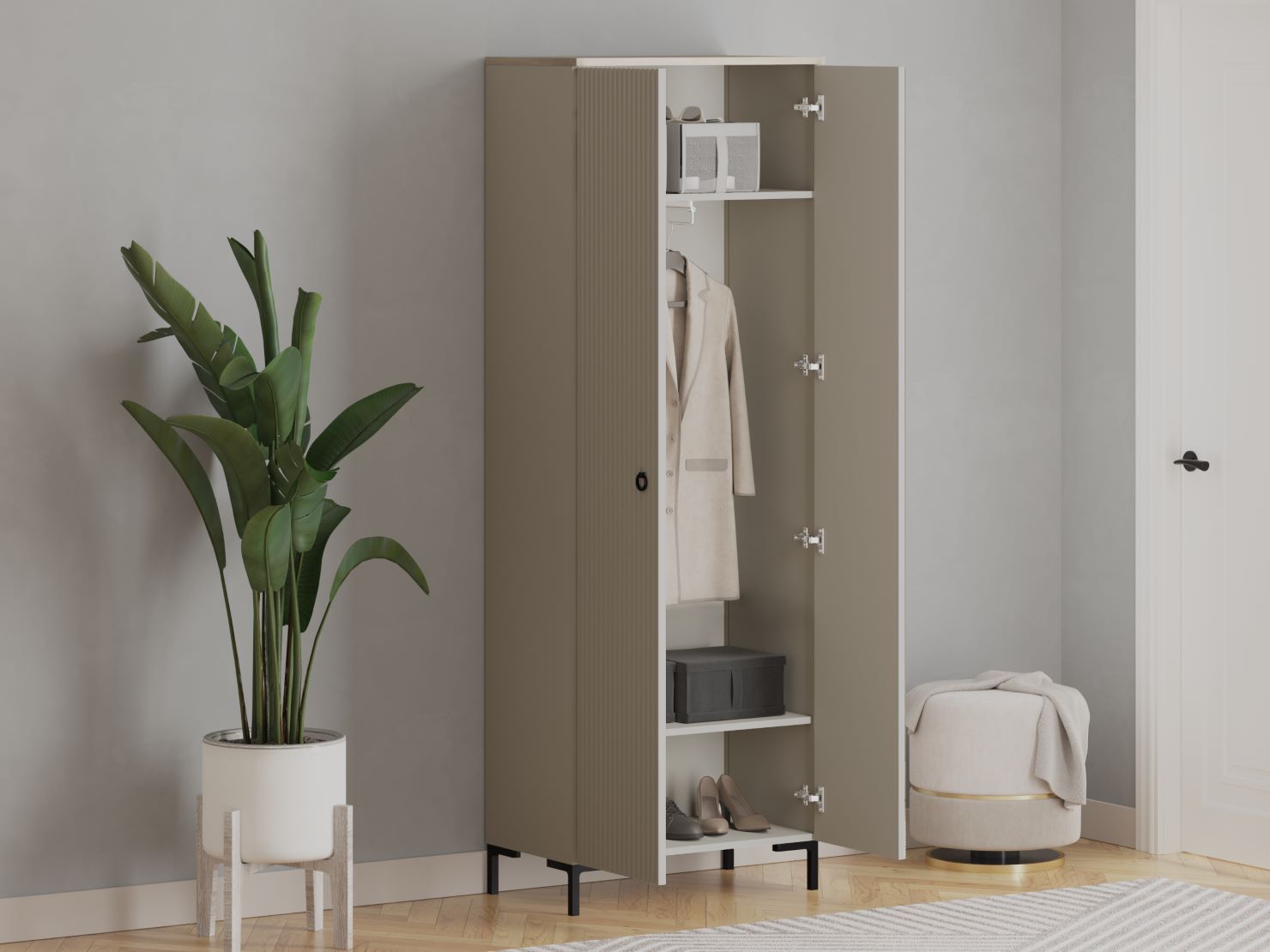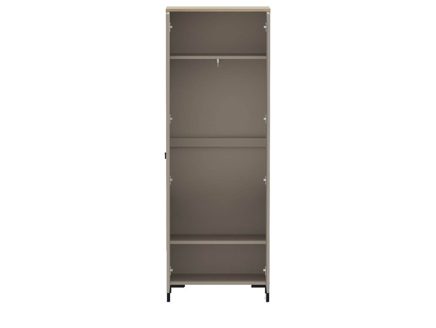 за 2 распашными дверями расположена выдвижная металлическая штанга для одежды и 2 вместительные полки