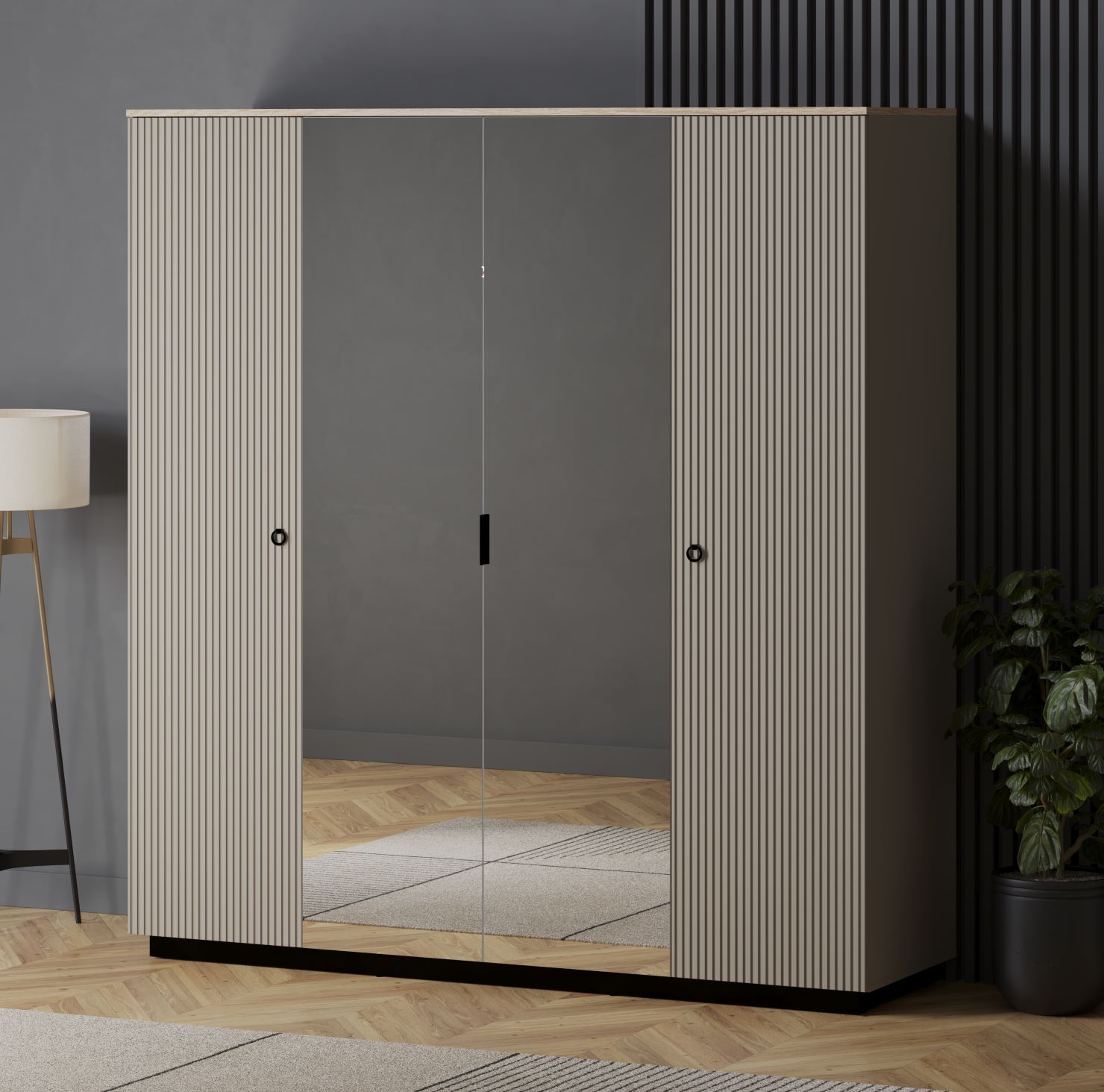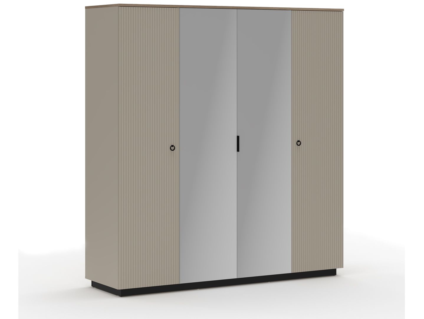 в центральной части шкафа — 2 зеркальные двери со скрытыми ручками; здесь размещена металлическая штанга для одежды и 2 вместительные полки