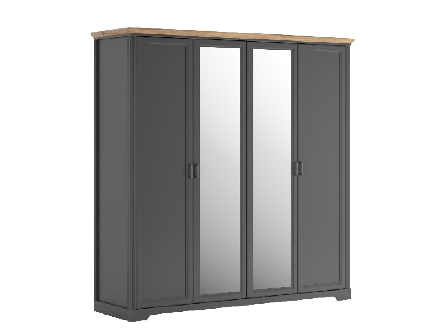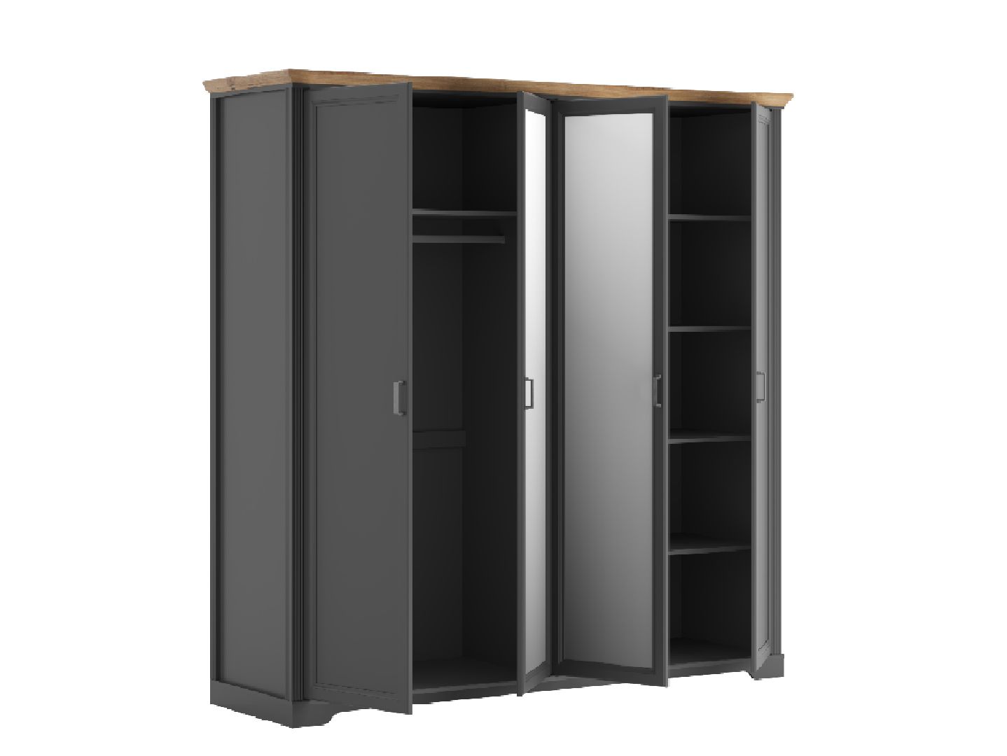 в центральной части шкафа расположены 2 двери с зеркалом, слева и справа — глухие распашные двери