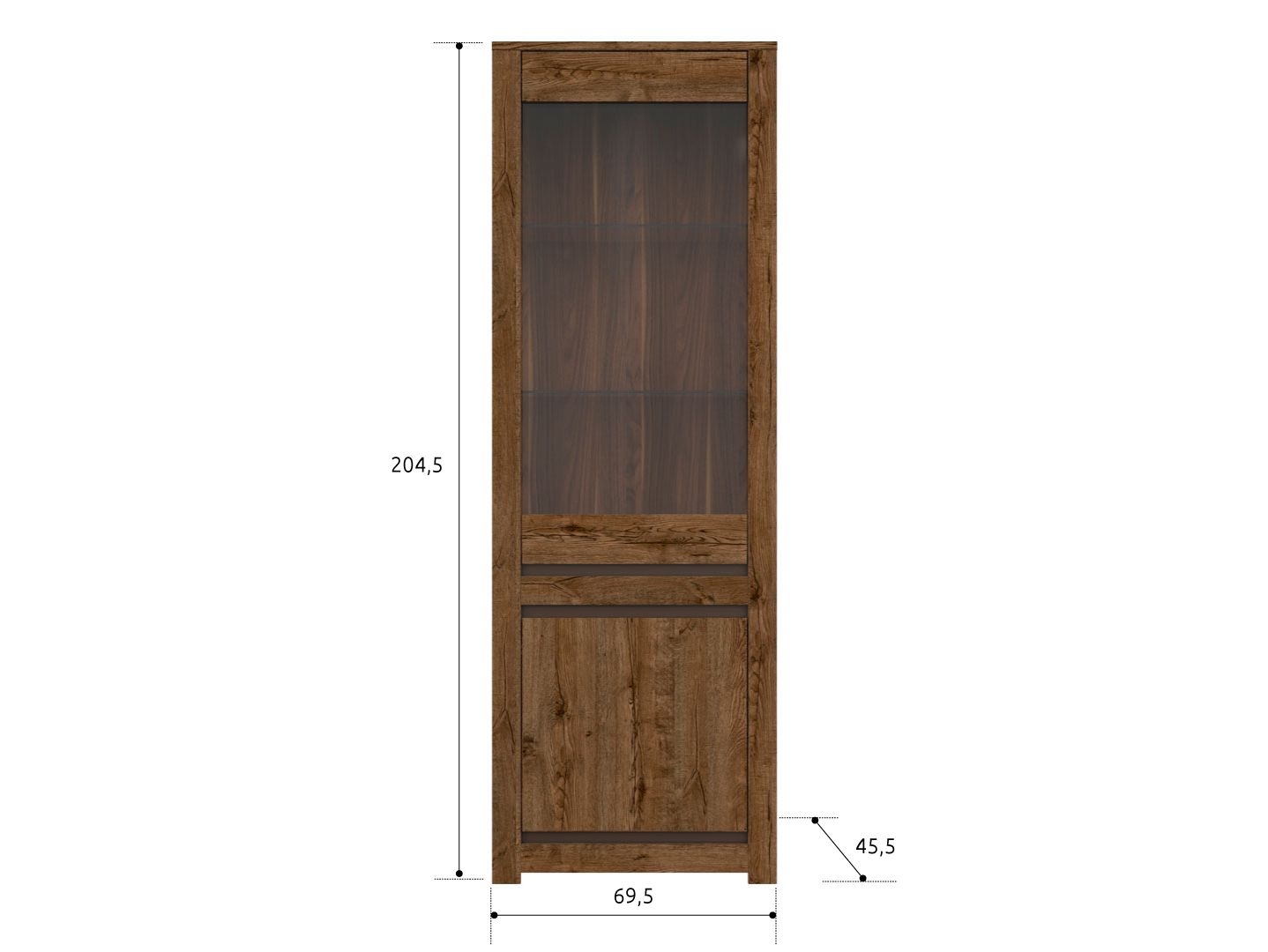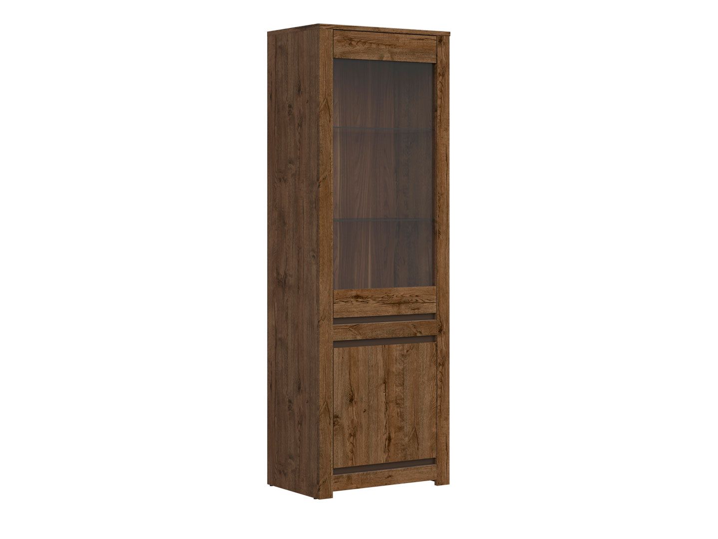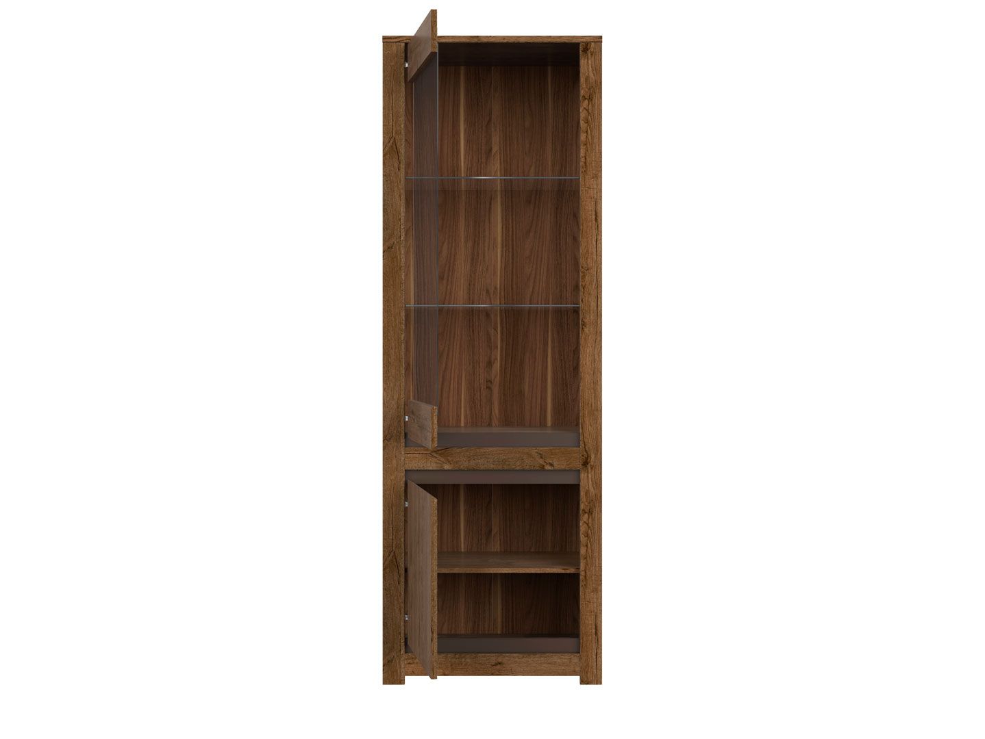 2 отделения: отделение с полками из ДСП за глухой дверью и отделение со стеклянными полками за дверью со стеклянной вставкой