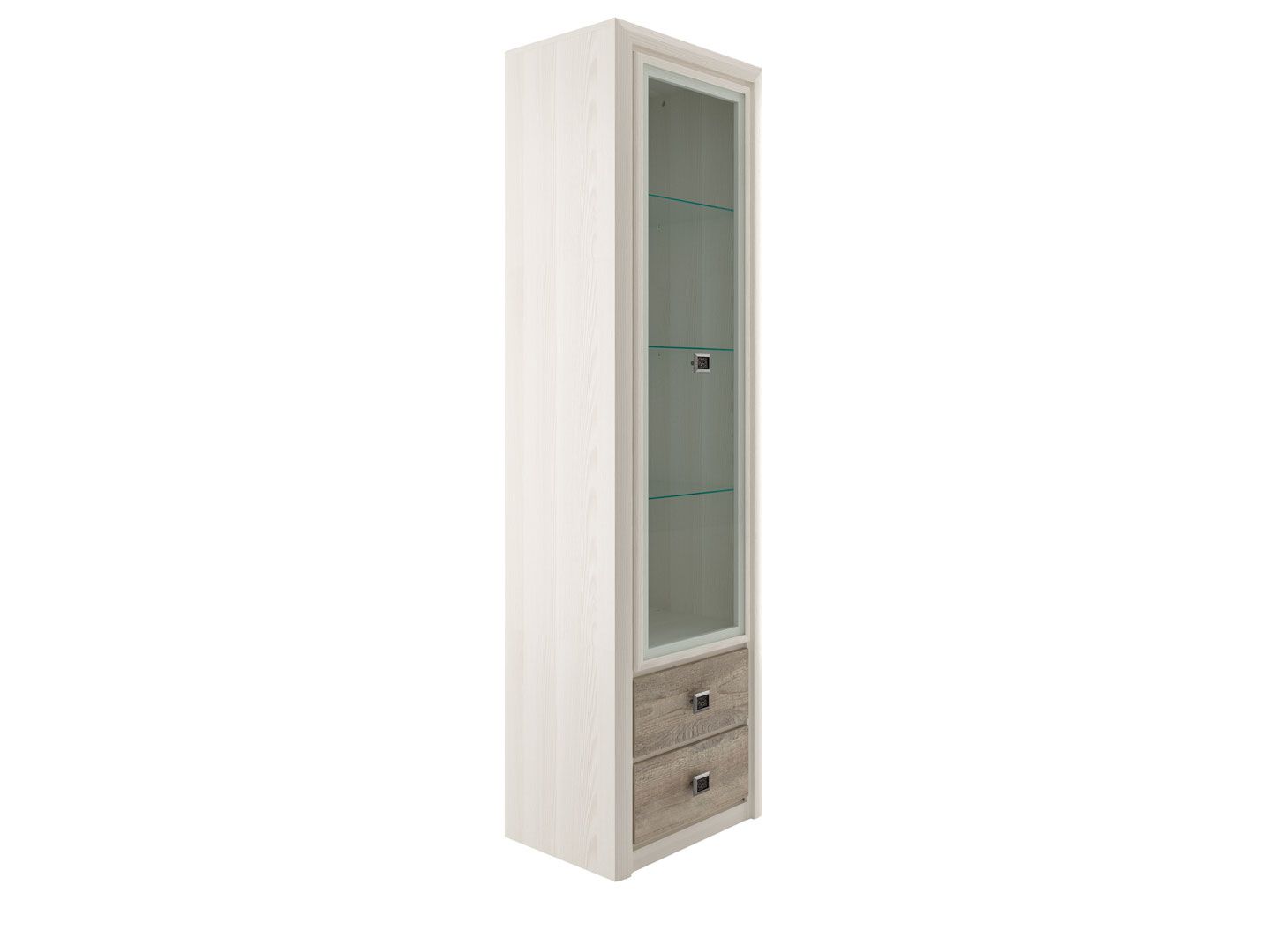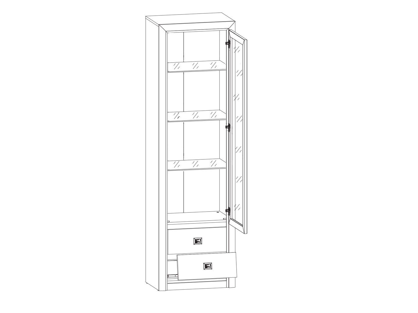 шкаф имеет одно вертикальное отделение с тремя вкладными стеклянными полками и отделением с двумя выдвижными ящиками