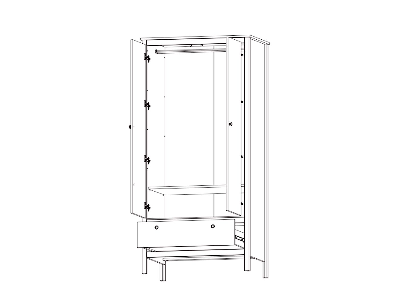 за распашными дверями расположены: стационарная штанга для одежды и полка