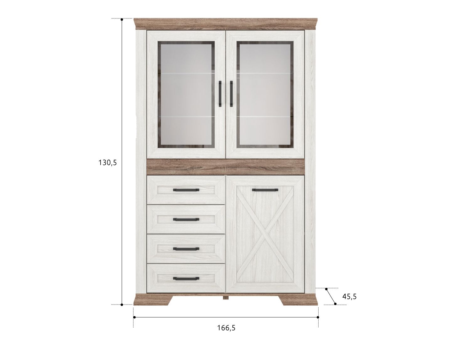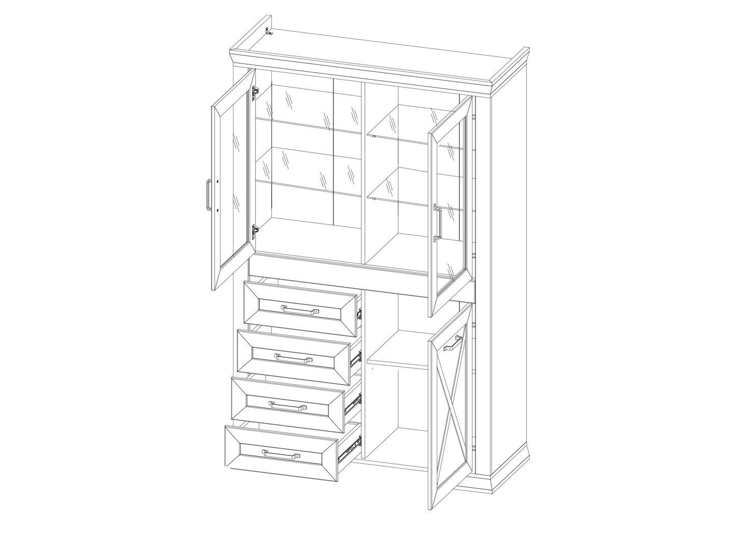 комбинированный шкаф с различными отделениями: отделения со стеклянными полками за распашными дверями со стеклянной вставкой (матовое стекло), 4 выдвижных ящика на металлических направляющих, отделение с полками за распашными глухими дверями