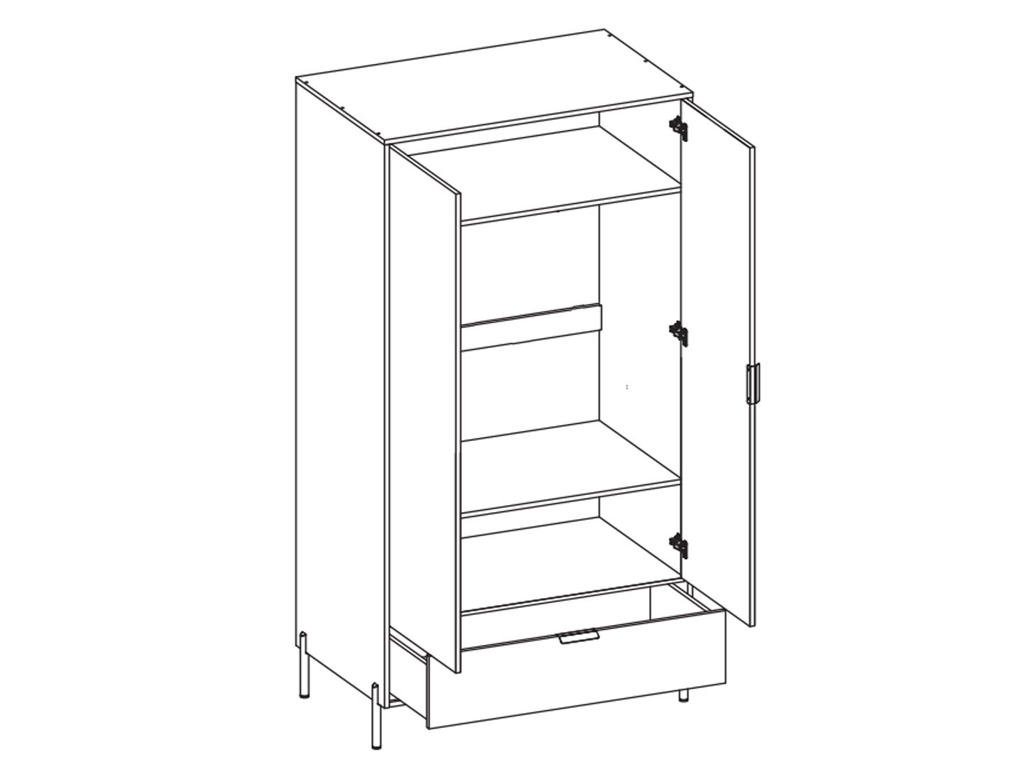 за 2 распашными глухим дверями расположена стационарная штанга для одежды и 2 вместительные полки