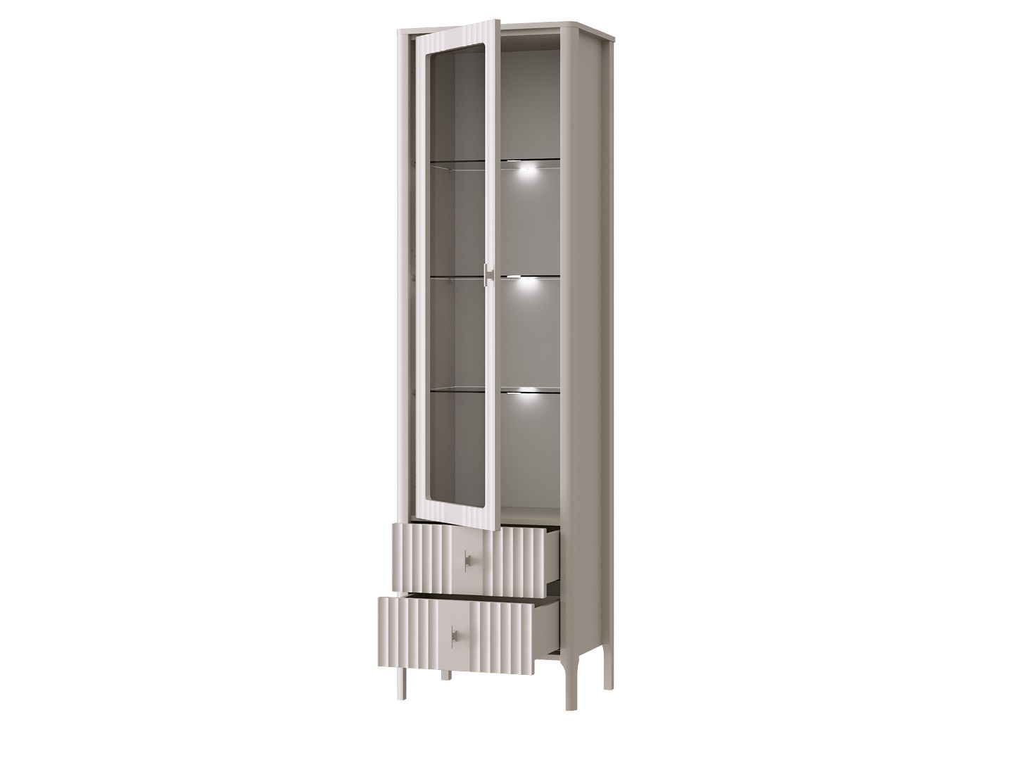 1 распашная дверь со стеклянной вставкой и 2 выдвижных ящика на направляющих скрытого монтажа частичного выдвижения плавного закрывания с рифлеными фасадами из МДФ
