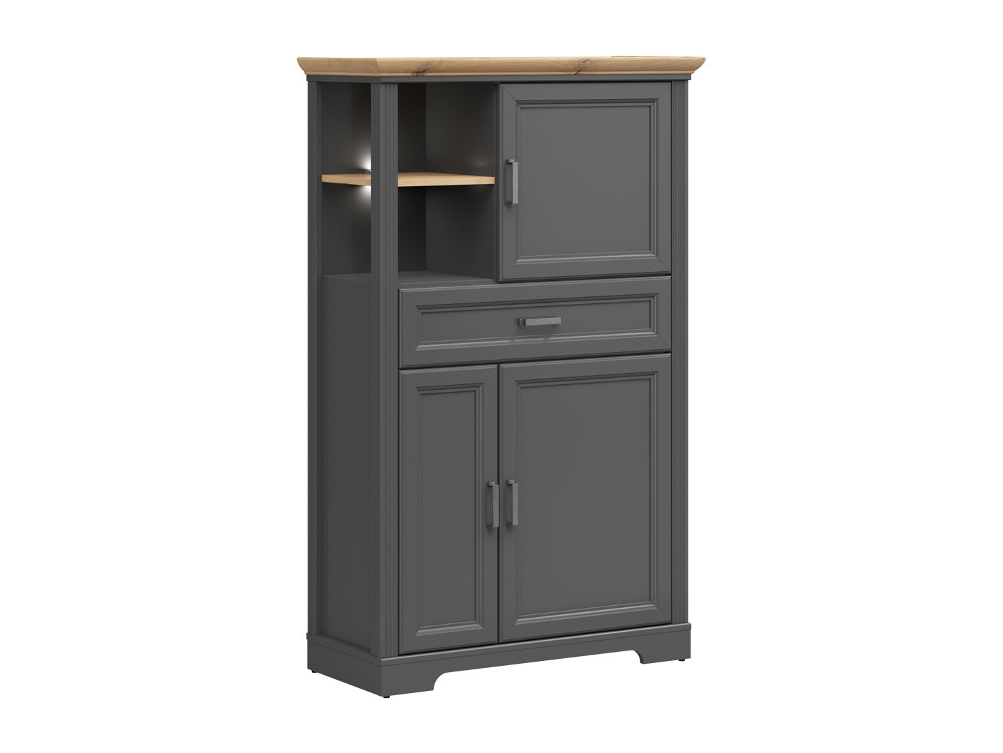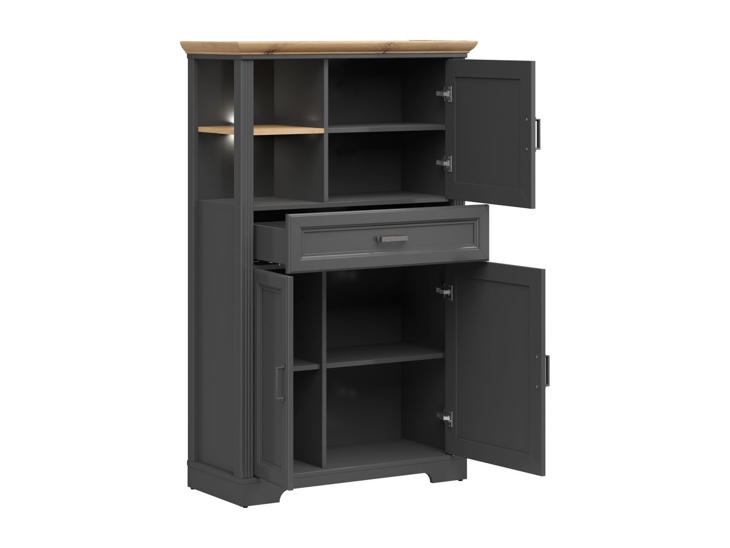 в верхней части шкафа расположены: открытое отделение с полкой, отделение за распашной дверью и выдвижной ящик на шариковых направляющих