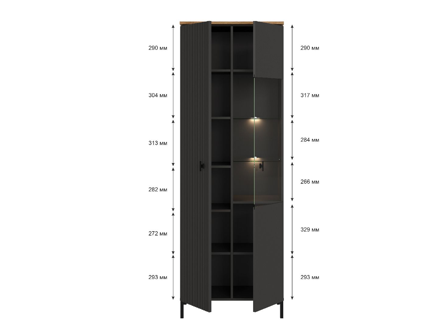 справа — 1 распашная дверь со стеклянной вставкой; за дверью расположено 6 отделений для хранения