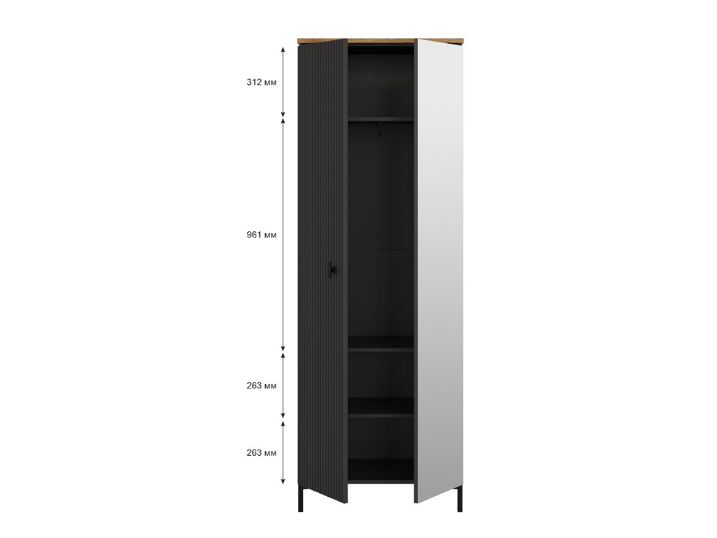 за 2 распашными дверями расположена выдвижная металлическая штанга для одежды и 2 вместительные полки