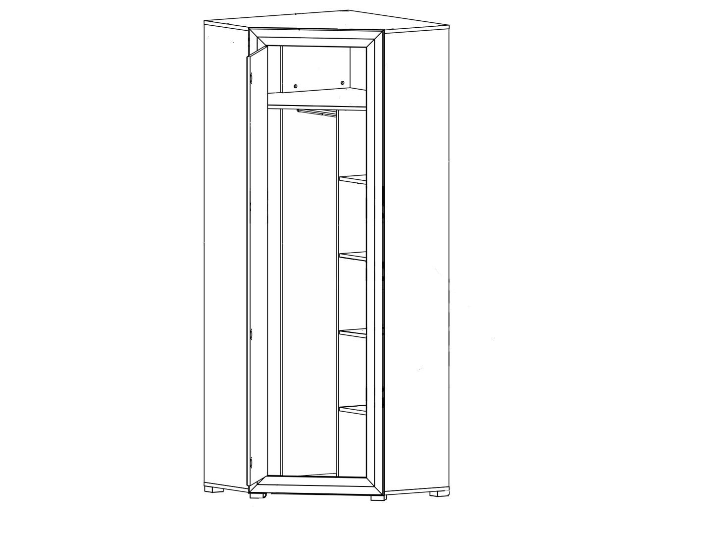 1 распашная дверь, за которой расположены: полка со скошенным углом, 5 глубоких ниш, 2 стационарные штанги для одежды