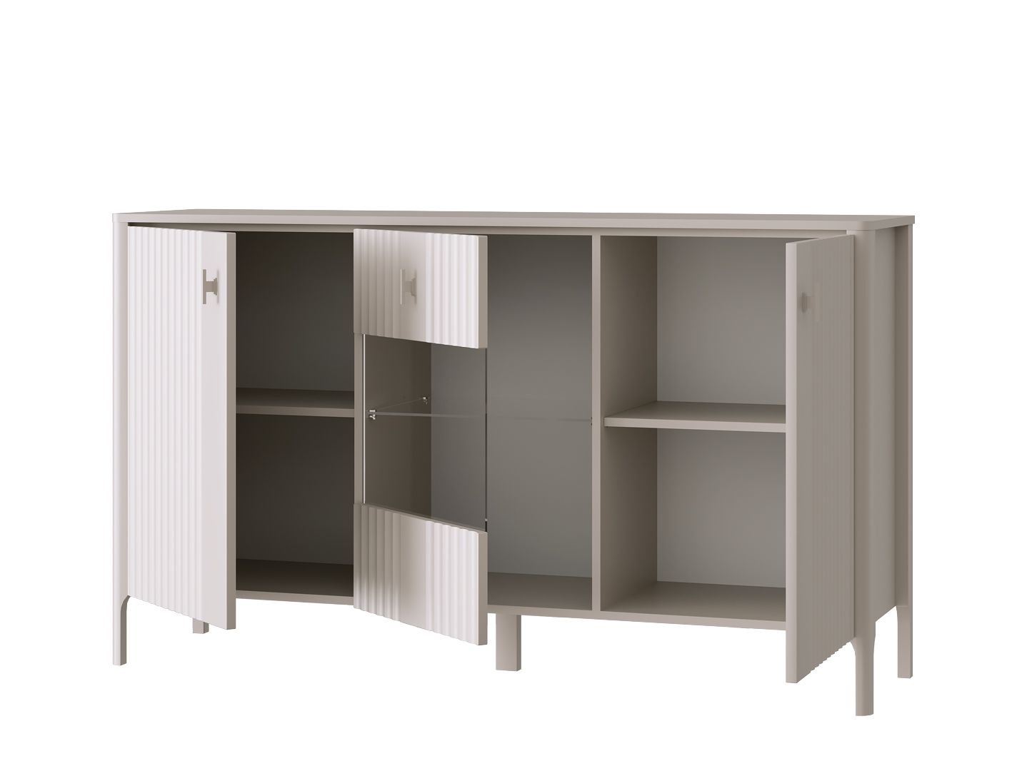 в правой и левой части тумбы расположены двери из МДФ с рифленой текстурой, за каждой из дверей по 2 вместительных отделения для хранения