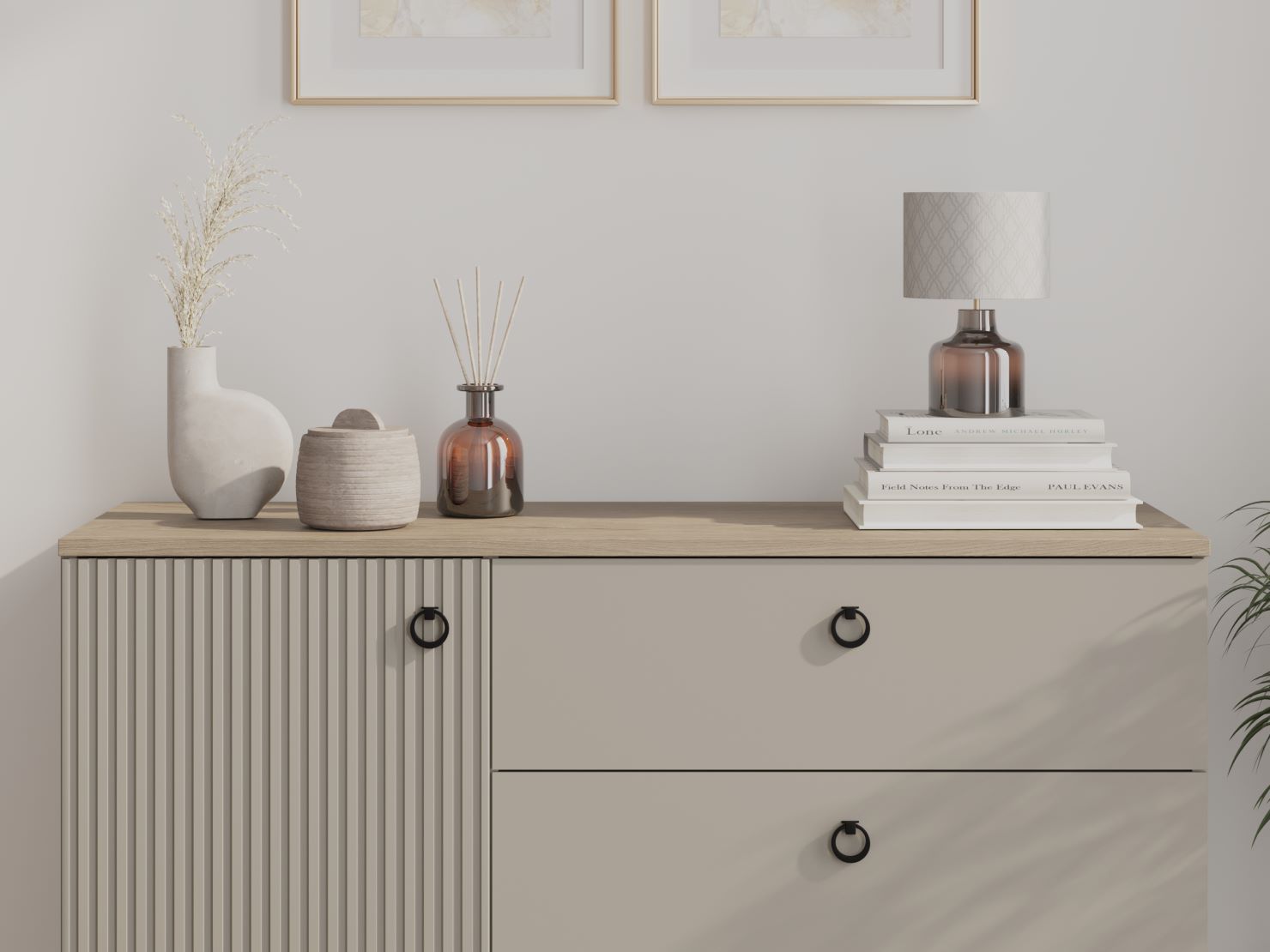 в левой части тумбы — распашная дверь с рифлеными фасадами, за которой 2 вместительных отделения для хранения