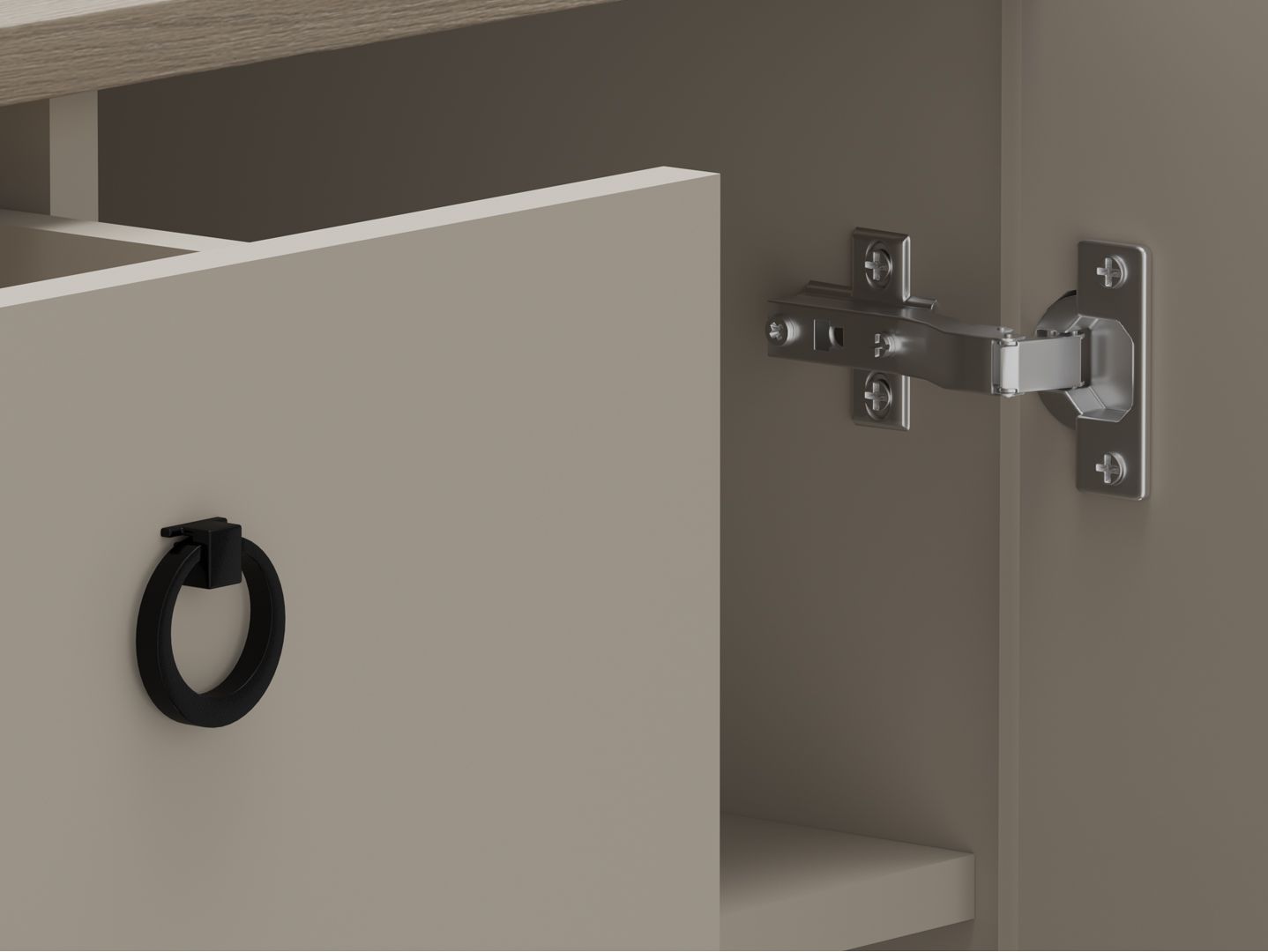 в левой части тумбы 1 выдвижной ящик на шариковых направляющих частичного выдвижения и 1 распашная дверь, за которой размещены 2 полки