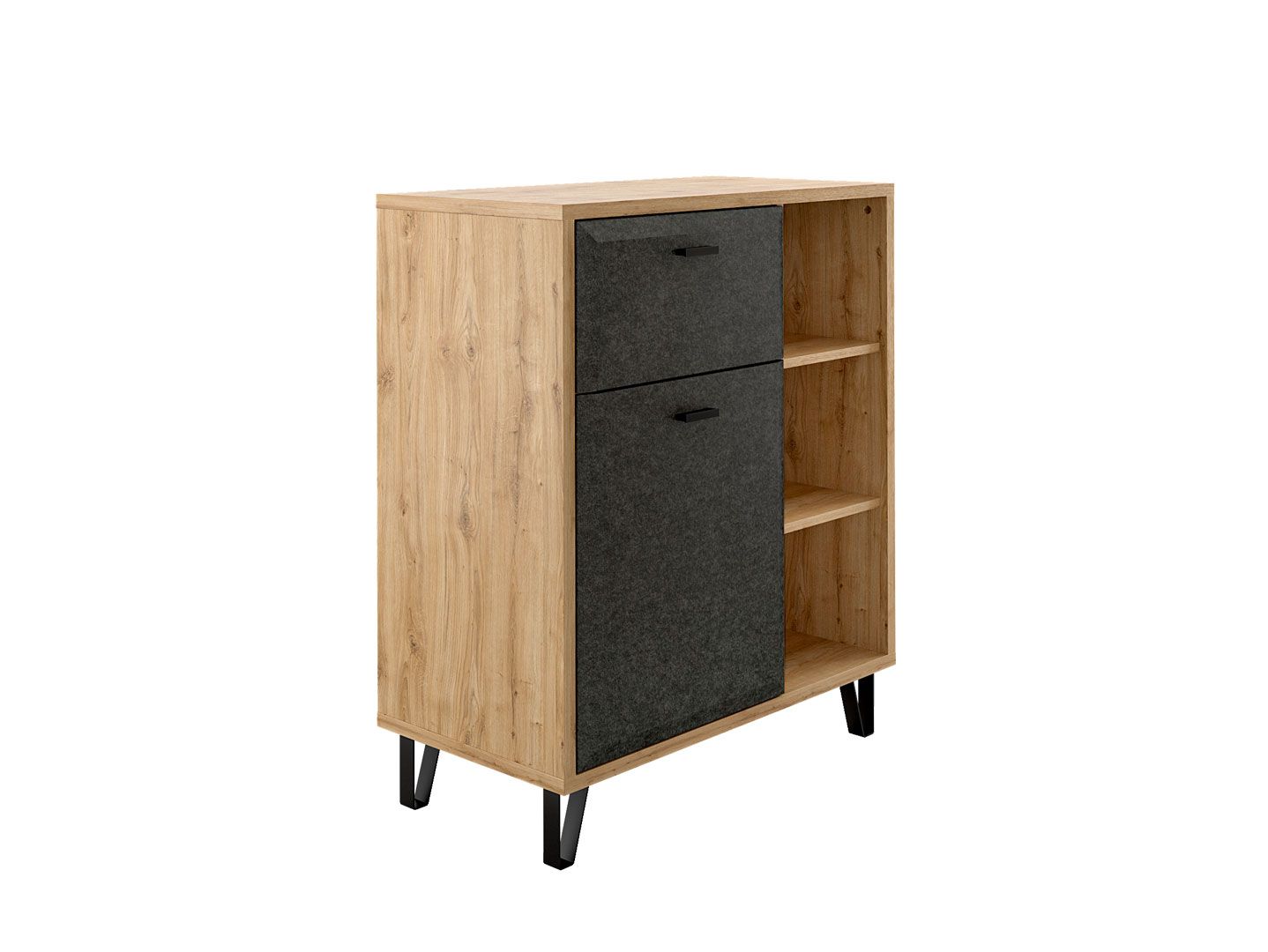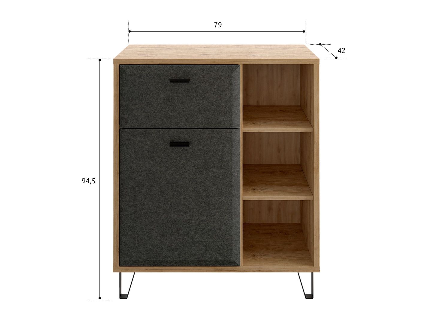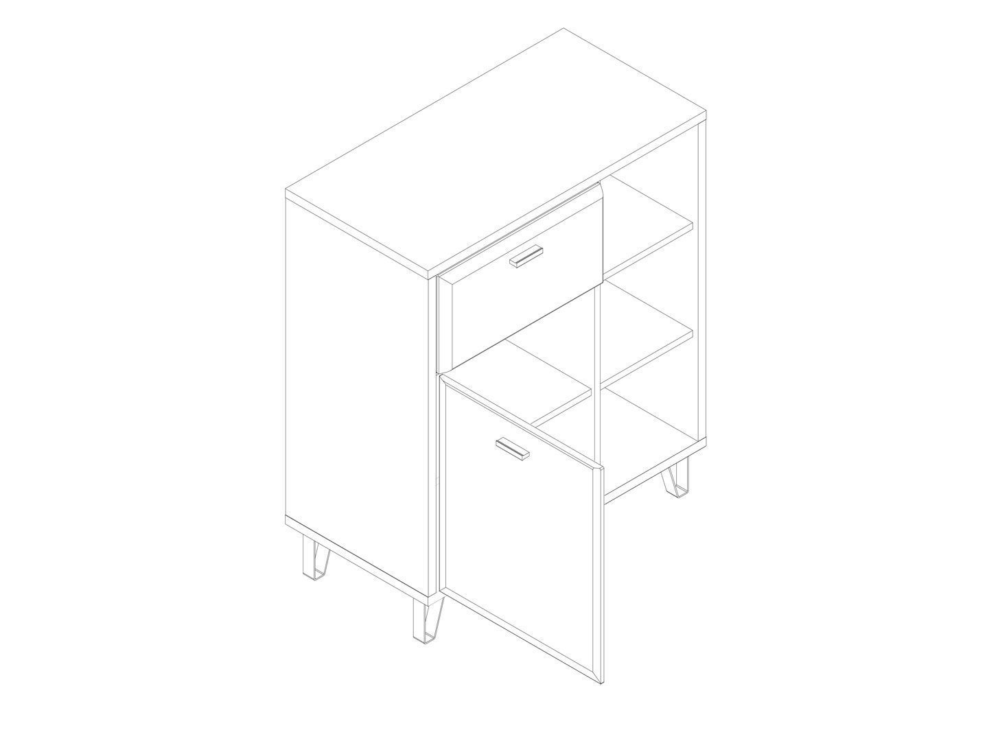 с левой стороны расположен 1 выдвижной ящик на направляющих скрытого монтажа с функцией плавного закрывания и 1 распашная дверь, за которой расположены 2 полки