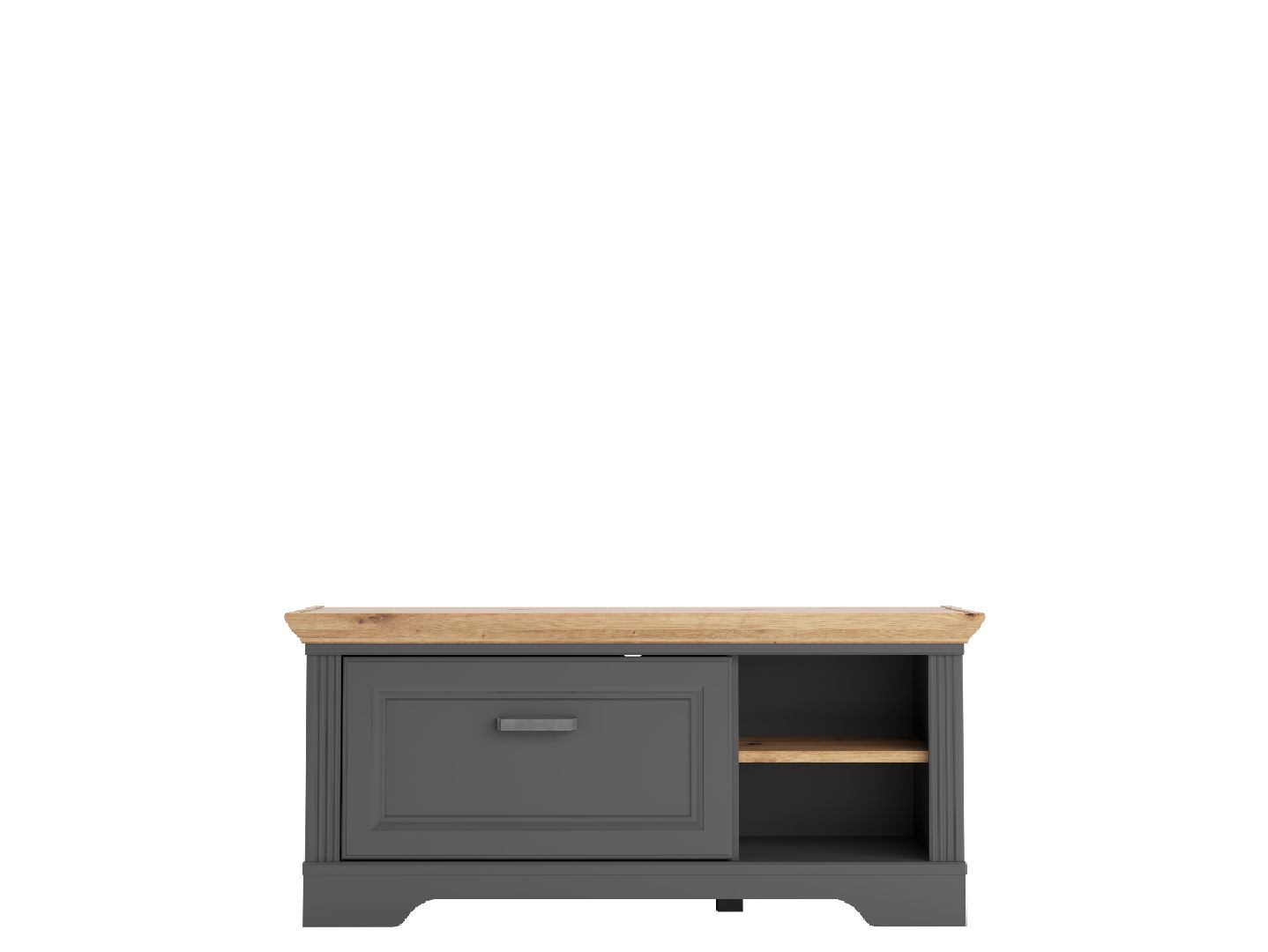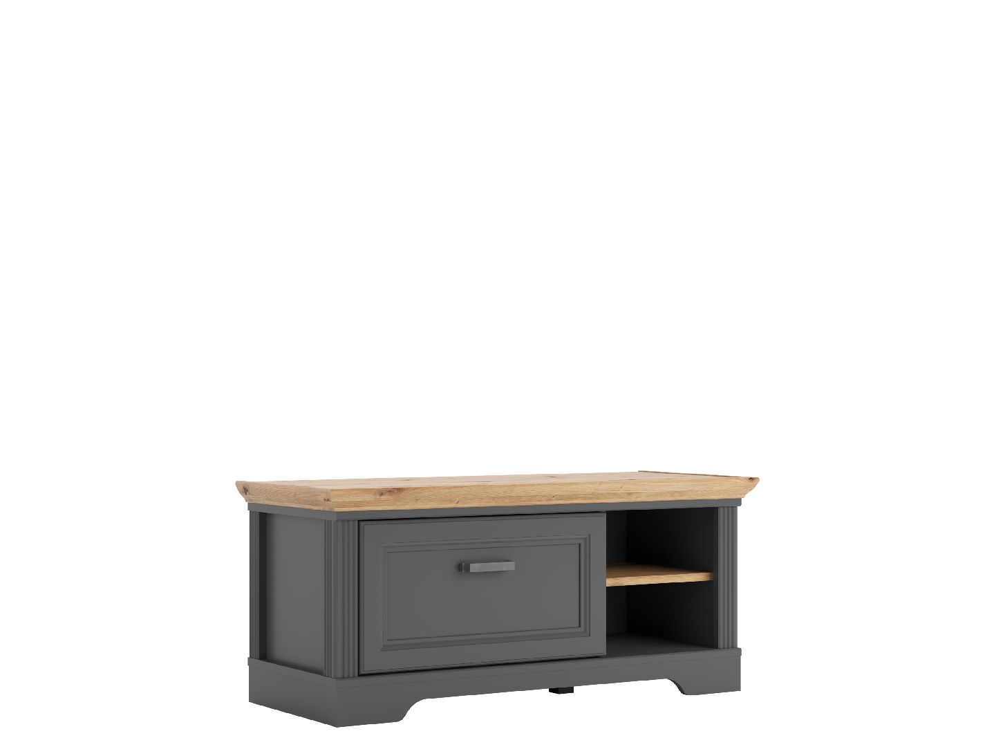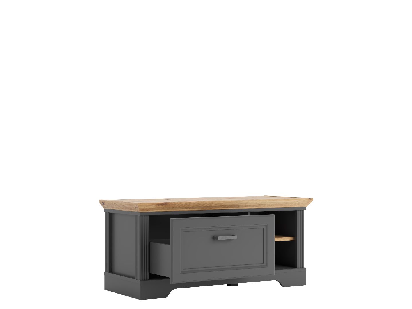 в левой части тумбы расположен выдвижной ящик на шариковых направляющих, в правой — открытые отделения для хранения
