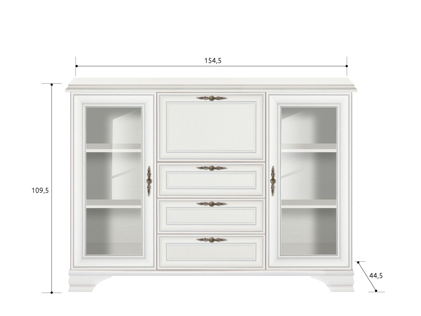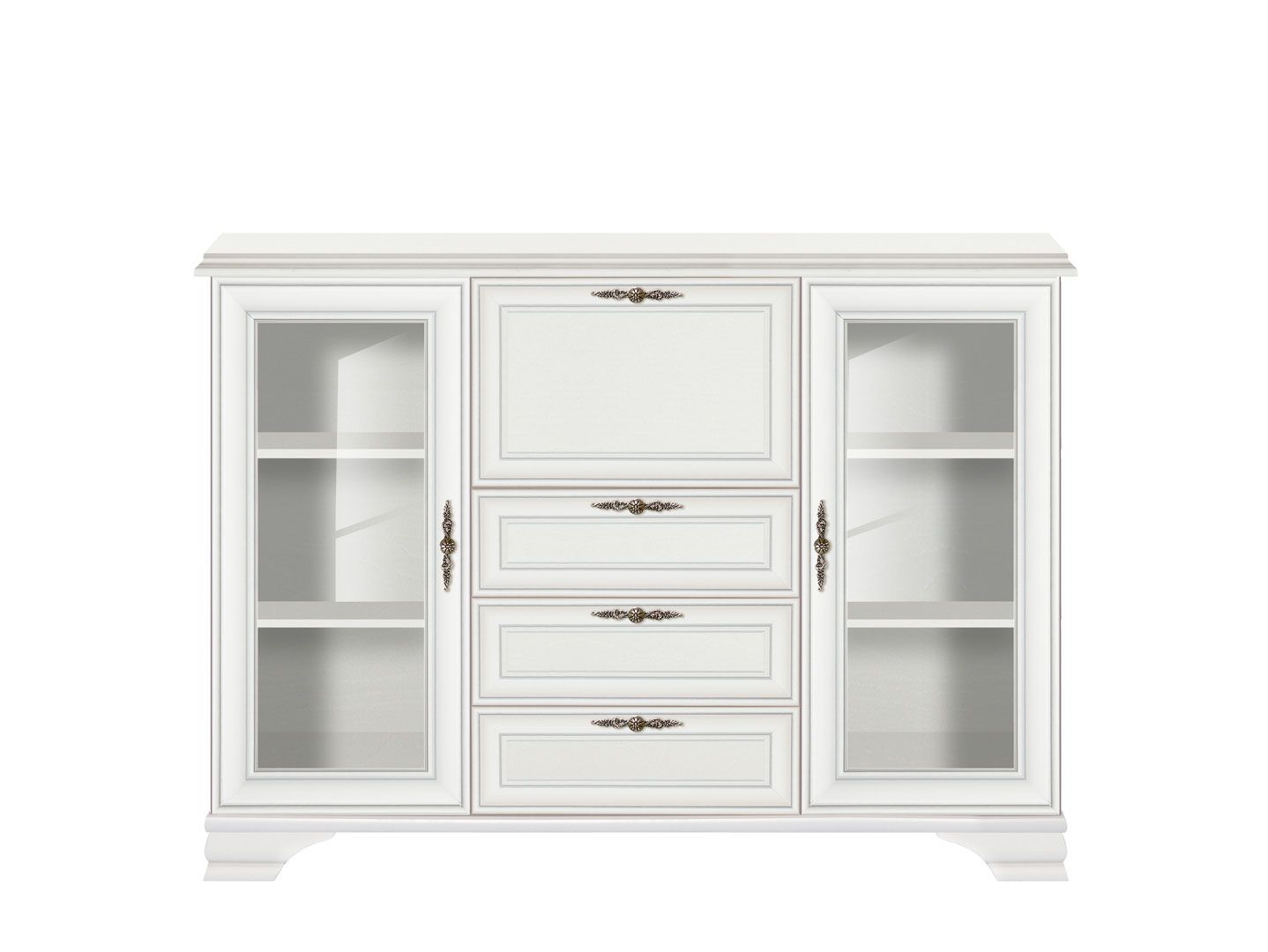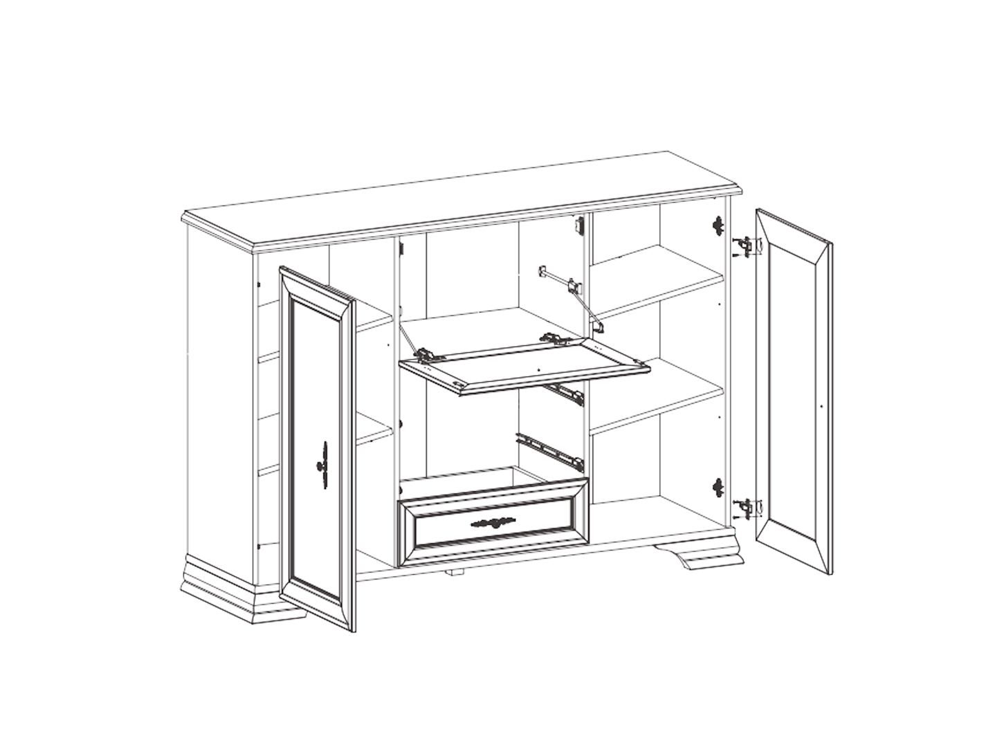 тумба разделена на 4 отделения: 2 отделения с полками за распашными дверями со стеклянной вставкой, отделение в центральной части за откидной дверью, 3 выдвижных ящика на металлических роликовых направляющих