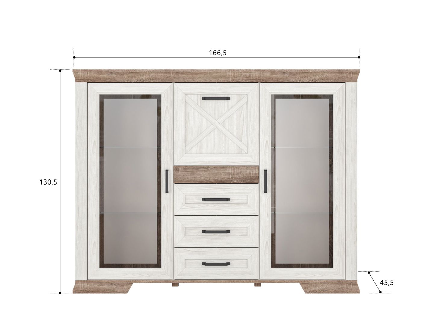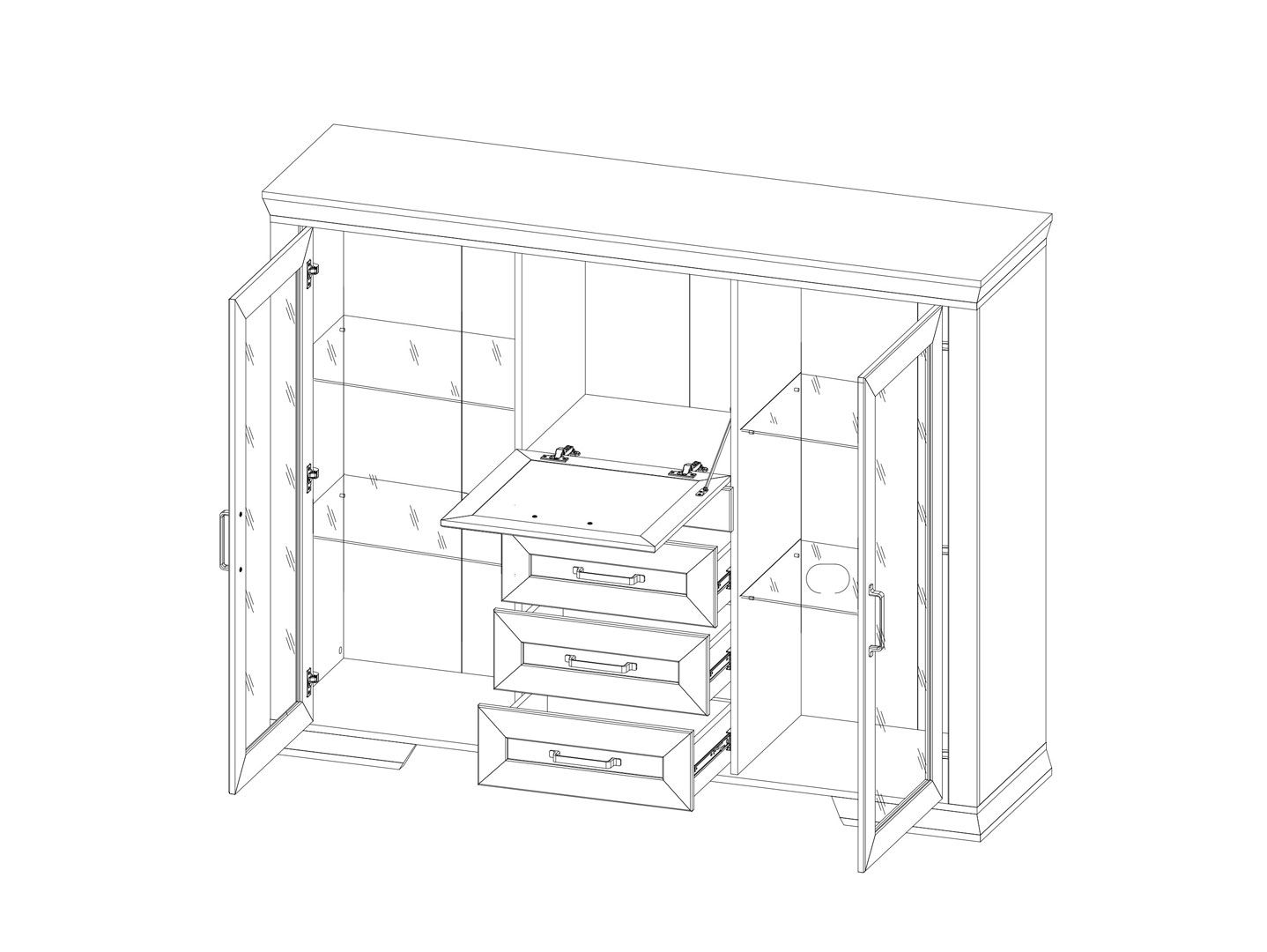 тумба разделена на 4 отделения: 2 отделения с полками за распашными дверями со стеклянной вставкой, отделение в центральной части за откидной дверью и 3 выдвижных ящика на металлических роликовых направляющих