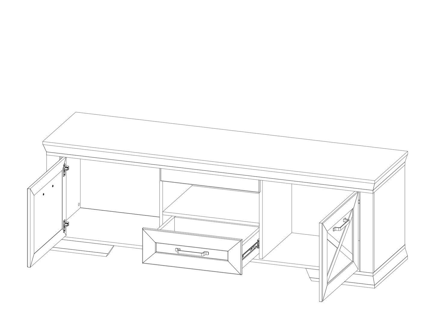 4 отделения: 1 выдвижной ящик на металлических направляющих, 1 открытое отделение и 2 отделения за распашными глухими дверями