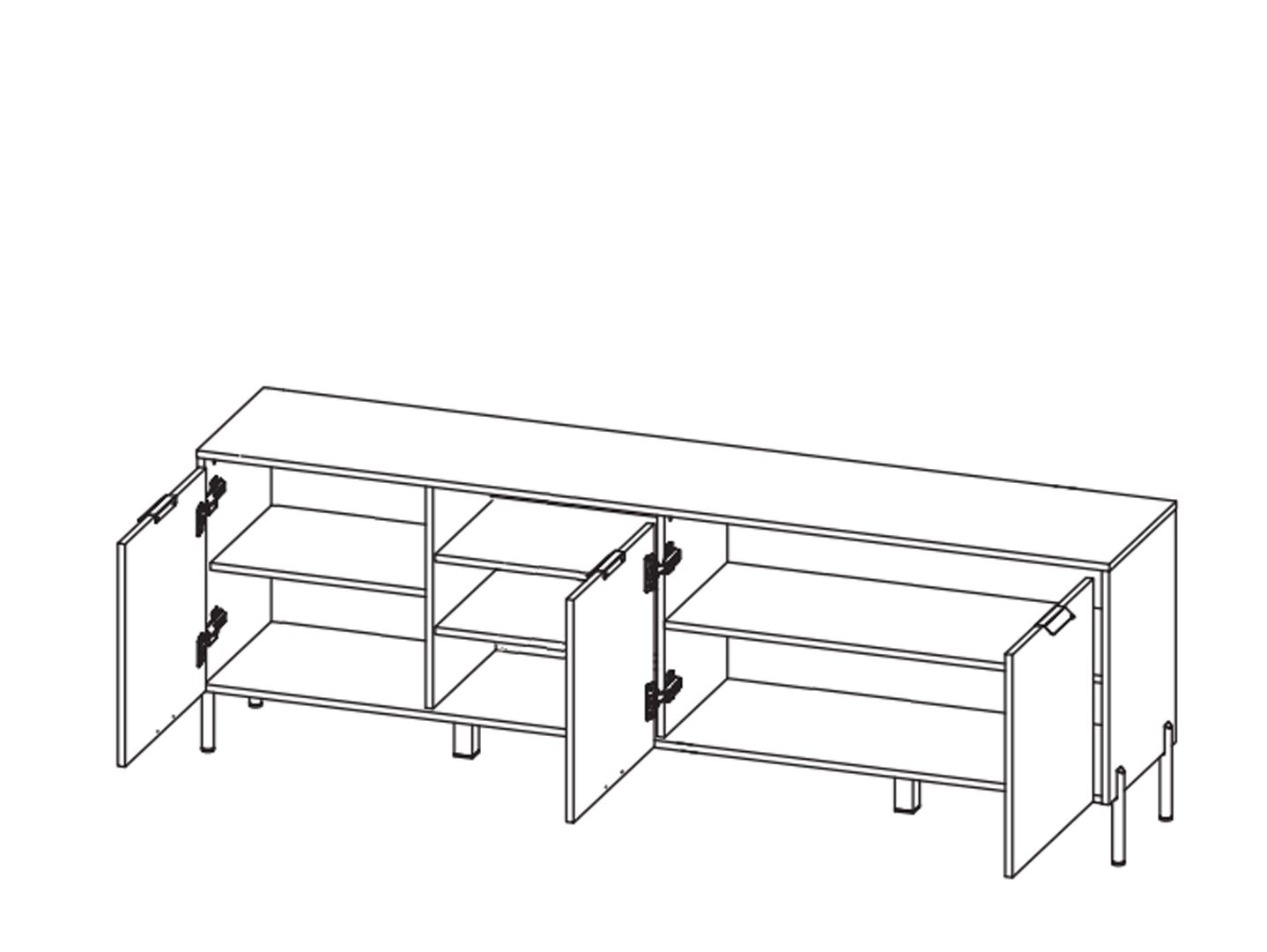 в левой части тумбы — открытое отделения с 2 полками и закрытое отделение с полками за глухой дверью