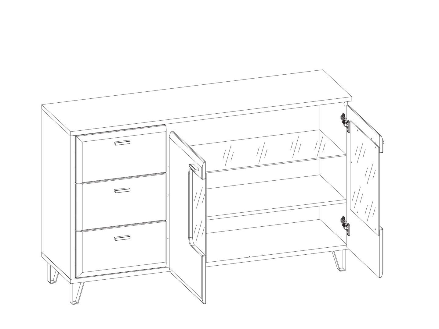 2 распашные двери со стеклом, за которыми расположены 1 стеклянная и 2 стандартные полки