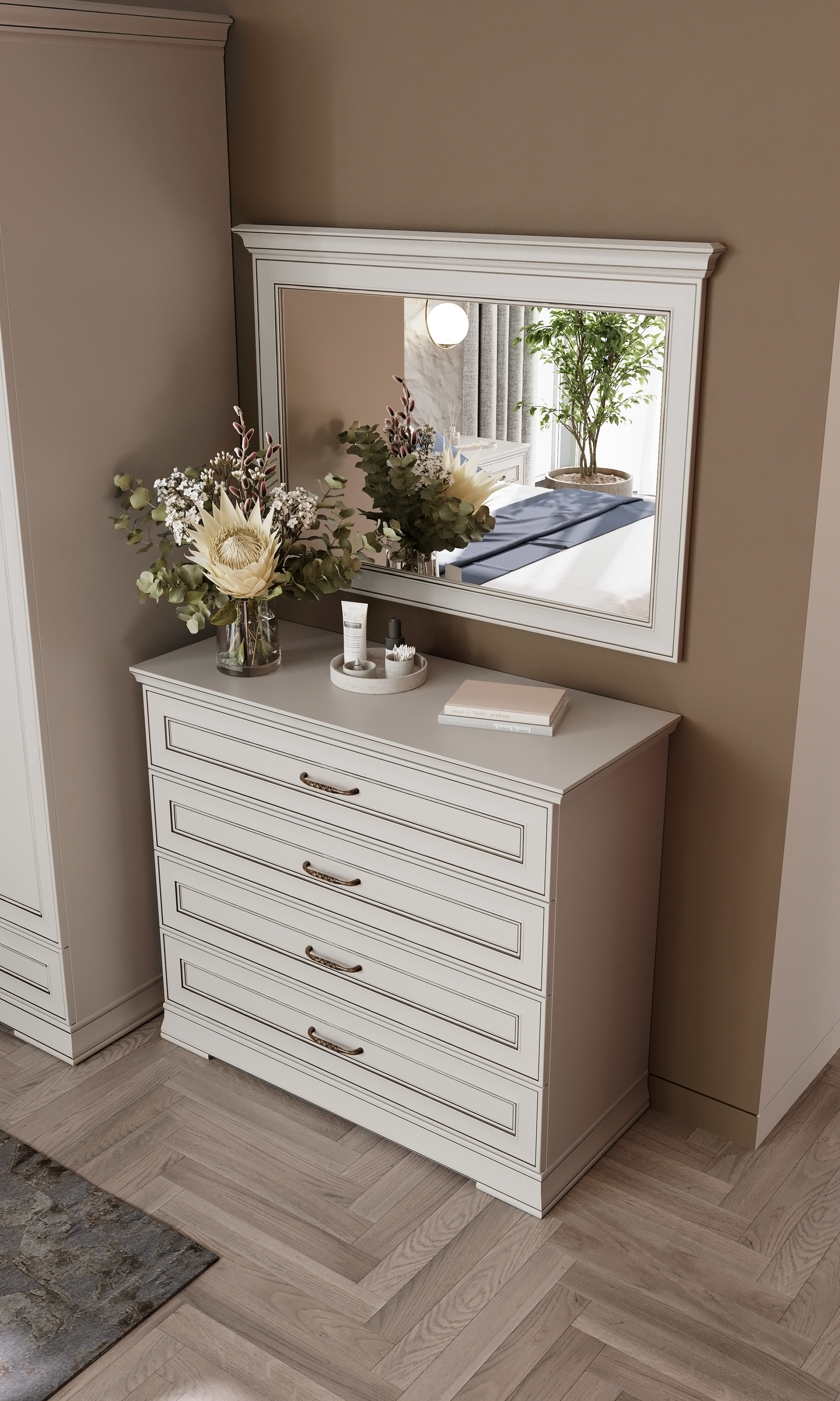 зеркальное полотно закреплено в рамку из планок декоративных из МДФ